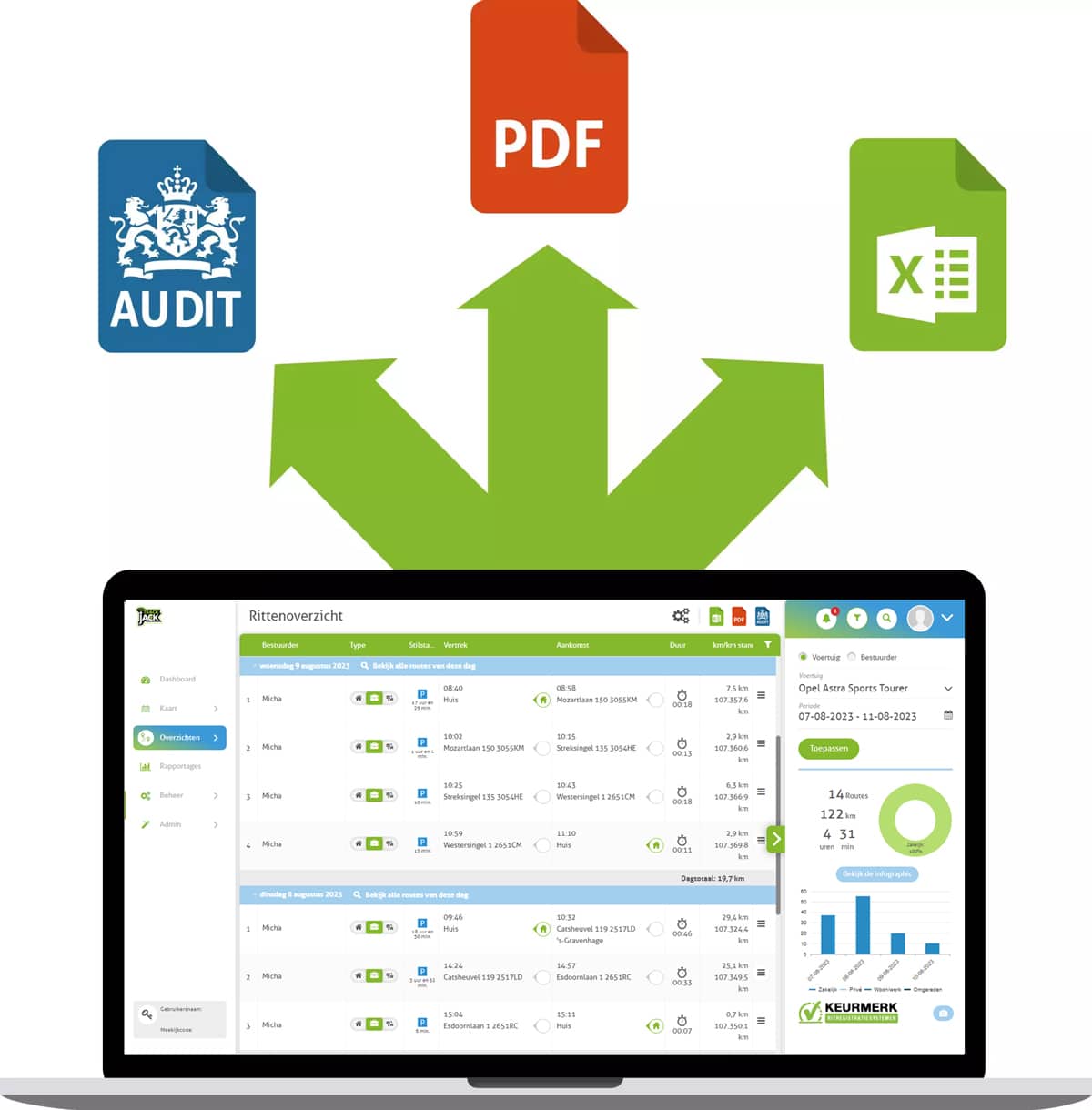 Mit nur wenigen Mausklicks kannst du die gesamte Fahrtenliste als Excel-Datei, PDF oder Auditfile für das Finanzamt herunterladen.