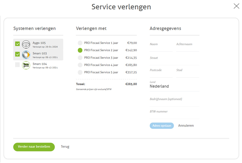 - Klicken Sie auf das Fahrzeug bzw. die Fahrzeuge, die Sie verlängern möchten, und klicken Sie auf „Service verlängern“.